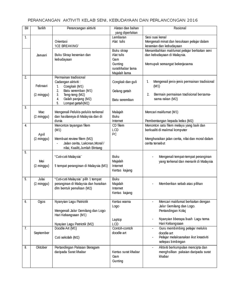 Cadangan Aktiviti Kelab Kesenian Kebudayaan Dan Perlancongan 2016 Pdf